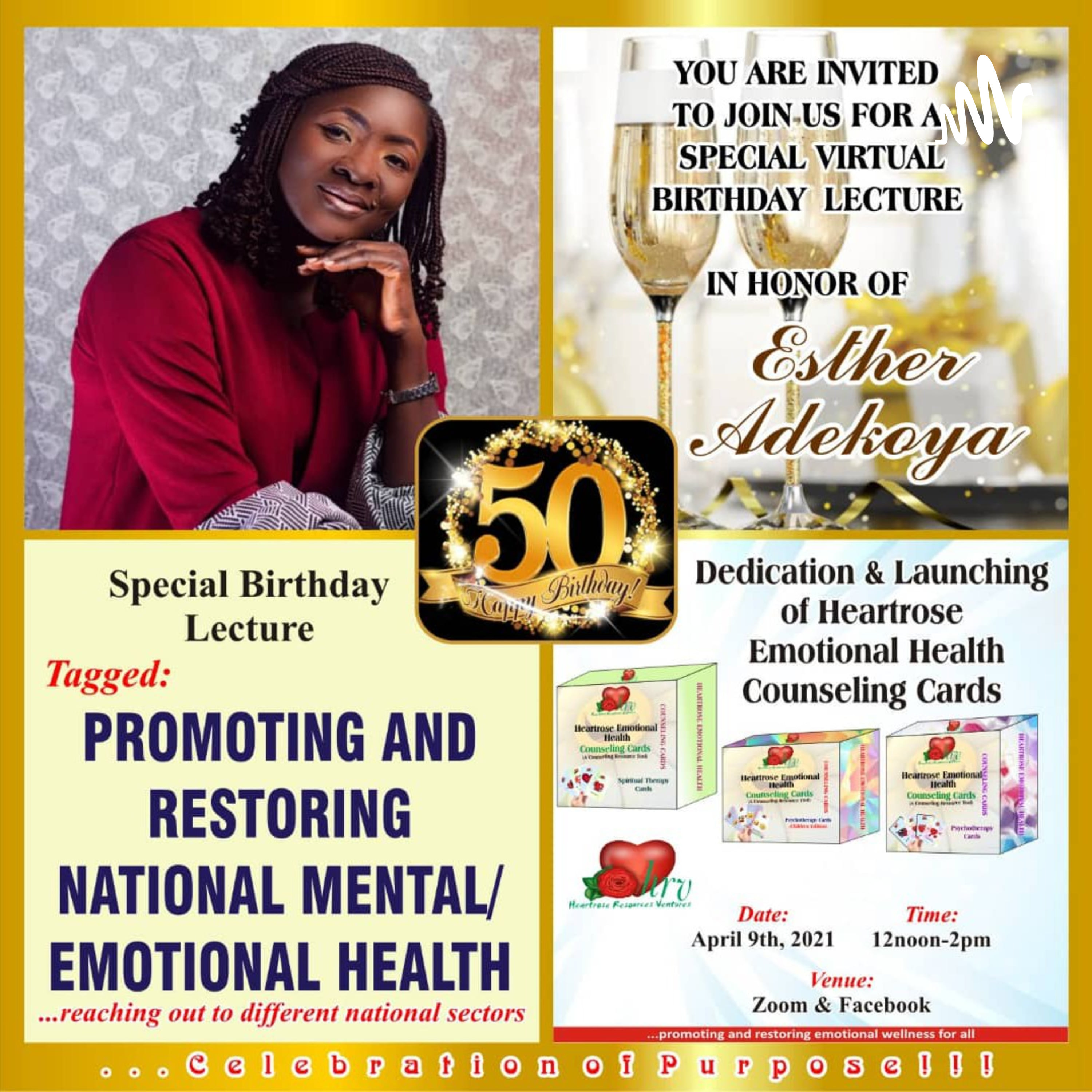 Unisciti a una lezione virtuale focalizzata sul miglioramento del benessere mentale ed emotivo nazionale in onore della celebrazione del 50° compleanno di Esther Adekoya.